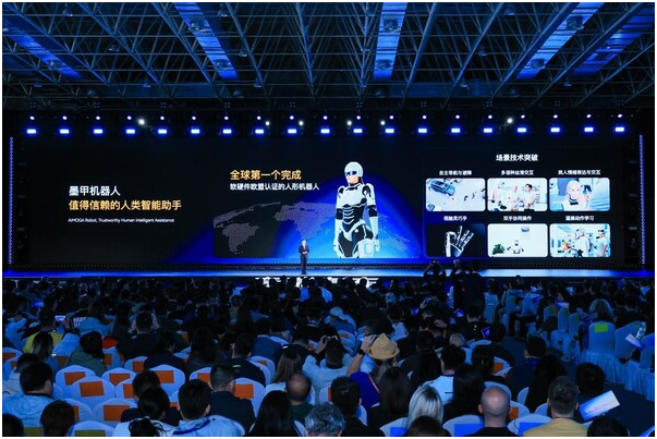 "我的故事要从三年前说起。"在奇瑞集团CTO高新华博士的精彩发言后,墨甲机器人"墨茵"登台亮相,并自主完成整场能力展示与演讲发布。在短短三分钟内,她系统回顾了奇瑞墨甲机器人从最初构想到产品落地,再到走向真实场景与全球市场的历程。